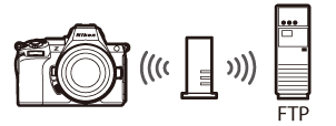 La telecamera e il server FTP si collegano tramite collegamento wireless diretto. La telecamera funge da punto di accesso LAN wireless, consentendo di connettersi quando si lavora all'aperto e in altre situazioni in cui il server FTP non è già connesso a una rete wireless ed eliminando la necessità di complicate regolazioni delle impostazioni.