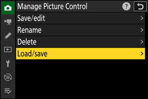 | [ Carica/salva ] | Copia i Picture Control personalizzati da e verso una scheda di memoria. |