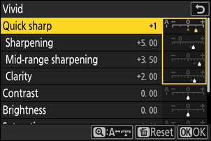 - Per regolare rapidamente i livelli di [ Nitidezza ], [ Nitidezza medio raggio ] e [ Chiarezza ] bilanciati, evidenziare [ Regolazione rapida ] e premere 4 o 2 .