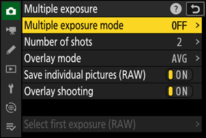 Per salvare sia l'esposizione multipla che gli scatti che la compongono, selezionare [ ON ]; gli scatti individuali vengono salvati in formato NEF ( RAW ). Per salvare solo l'esposizione multipla, selezionare [ OFF ].