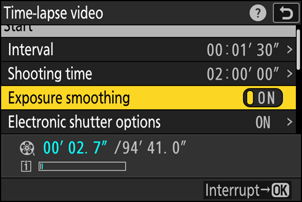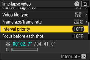 Per terminare la ripresa prima che tutte le foto siano state scattate, premere J o selezionare [ Video time-lapse ] nel menu di ripresa foto, evidenziare [ No ] e premere J Si noti che i menu potrebbero non essere visualizzati quando si preme il pulsante G se il tempo selezionato per [ Intervallo ] è molto breve.