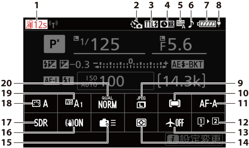 設定に応じたアイコンや項目が表示されます。この他にも設定を変更したときなどに一時的に表示されるアイコンや警告表示があります。