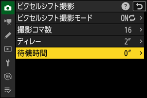 - [待機時間]を選んで2を押します。コマ間の撮影間隔を秒単位で設定できます。