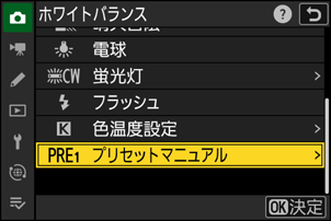 静止画撮影メニューまたは動画撮影メニュー[ホワイトバランス]で[プリセットマニュアル]を選んでマルチセレクターの2を押す