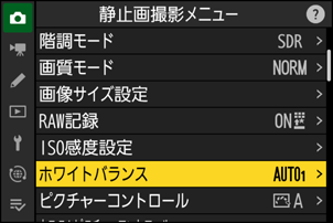 ホワイトバランスは静止画撮影メニューまたは動画撮影メニューでも設定できます。