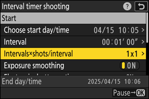 Аралықтардың санын және әр аралықтағы түсірілімдер санын таңдап, J түймесін басыңыз.