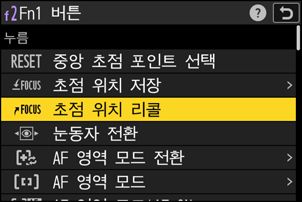 - [초점 위치 리콜]이 할당된 컨트롤을 누르고 있으면 수동 초점(MF)이 활성화되고 컨트롤을 누르는 동안 셔터 버튼을 반누름하면 카메라가 다시 초점을 맞추지 않습니다.