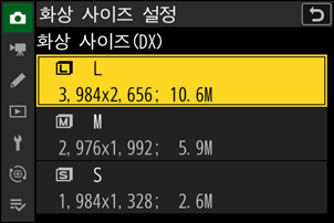 새 JPEG 및 HEIF 화상 사이즈를 선택합니다. NEF (RAW) 이외의 포맷으로 촬영된 사진에 대해 [L], [M] 및 [S] 중에서 사이즈를 선택할 수 있습니다.