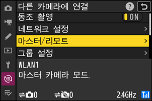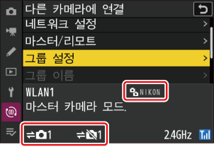 - [마스터 카메라]: 마스터 카메라의 셔터 버튼을 누르면 리모트 카메라의 셔터가 릴리즈됩니다. 각 그룹에는 하나의 마스터만 있습니다. 그룹에 여러 개의 마스터 카메라가 있으면 네트워크에 연결된 첫 번째 카메라만 실제로 해당 용량을 제공합니다.