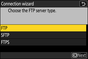 Pažymėkite [ FTP ], [ SFTP ] (SSH FTP ) arba [ FTPS ] ( FTP -SSL ) ir paspauskite J , kad būtų rodomas dialogo langas, kuriame galėsite įvesti serverio adresą.