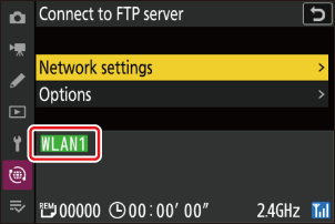 Tinklo meniu pasirinkite [ Connect to FTP server ], tada pažymėkite [ Network settings ] ir paspauskite 2 .