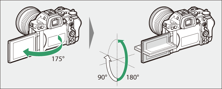 - Švelniai pasukite monitorių jo vyrių ribose. Per didelės jėgos naudojimas gali sugadinti fotoaparatą arba monitorių.