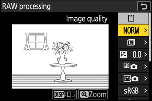 - Prieš apdorodami sureguliuokite nustatymus, tokius kaip baltos spalvos balansas ir Picture Control . Jei reikia, pakeiskite nustatymus, kurie galiojo fotografuojant. Norėdami sužinoti elementus, kuriuos galima konfigūruoti, žr. „Konfigūracijos elementai SDR vaizdo RAW apdorojimo metu“ ( 0 konfigūracijos elementų SDR vaizdo RAW apdorojimo metu ).