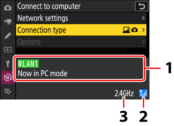 - Band : Kai jungiatės belaidžiu būdu Wi-Fi stoties režimu, rodoma prijungto SSID tinklo radijo dažnių juosta. Wi-Fi prieigos taško režimu rodoma radijo dažnių juosta, kurią išveda fotoaparatas.