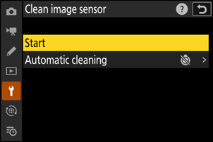 - Iestatīšanas izvēlnē atlasiet [ Clean image sensor ], pēc tam iezīmējiet [ Start ] un nospiediet J , lai sāktu tīrīšanu.
