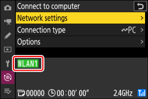 Tīkla izvēlnē atlasiet [ Connect to computer ], pēc tam iezīmējiet [ Network settings ] un nospiediet 2 .