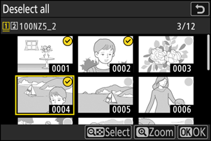 ) un noņemiet pašreizējā attēla atlasi, vēlreiz nospiediet pogu W ( Q ). - Lai skatītu iezīmēto attēlu pilnekrāna režīmā, nospiediet un turiet pogu X