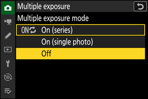 - Nepārtrauktās uzņemšanas režīmos kamera ieraksta visas ekspozīcijas vienā sērijā. Ja ir atlasīts [ On (single photo) ], vairākkārtējas ekspozīcijas uzņemšana tiks pabeigta pēc pirmās daudzkārtējās ekspozīcijas ierakstīšanas. Ja ir atlasīts [ On (series) ], ikreiz, kad tiek nospiesta aizvara atbrīvošanas poga, tiks ierakstīta papildu daudzkārtēja ekspozīcija.