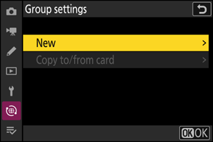 Tīkla izvēlnē dodieties uz [ Connect to other cameras ] > [ Group settings ] > [ Copy to/from card ], iezīmējiet [ Copy to card ], nospiediet 2 un pēc tam iezīmējiet grupas iestatījumus, kurus vēlaties saglabāt, un vēlreiz nospiediet 2 . Atlasiet galamērķi (1–99) un nospiediet J lai kopētu grupas iestatījumus atmiņas kartē. Saglabātos grupas iestatījumus var ielādēt, izmantojot [ Copy from card ].
