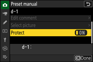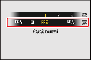 Iepriekš iestatītajai manuālajai baltā balansa izvēlnei var piekļūt, fotoattēlu uzņemšanas izvēlnē atlasot [ White balance ] > L [ Preset manual ]. Iepriekš iestatītā manuālā baltā balansa izvēlne piedāvā opcijas iepriekš iestatīta manuāla baltā balansa vērtību kopēšanai no esošas fotogrāfijas vai komentāru pievienošanai vai baltā balansa priekšiestatījumu aizsardzībai.