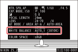 - Fotoattēlu informācijas lapā [ Basic shooting data ] attēliem, kas uzņemti ar baltā balansam atlasīto 4 [ Auto ], D [ Natural light auto ] vai L [ Preset manual ] , ir norādīta krāsu temperatūra, kas bija spēkā attēla uzņemšanas laikā ( 0 Basic Shooting Data ). Varat to izmantot kā atsauci, izvēloties K vērtību [ Choose color temperature ].