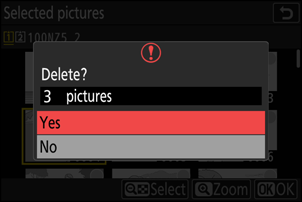 - De camera geeft een lijst weer met alle foto's met de beoordeling d (kandidaat voor verwijdering). Foto's die u op dat moment niet wilt verwijderen, kunt u deselecteren door ze te markeren met de multi-selector en op W ( Q ) te drukken.