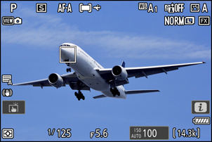Hvis et fly oppdages når [ Fly ] er valgt, vil fokuspunktet vises over det aktuelle flyet. Kameraet vil oppdage kroppen, nesen eller cockpiten avhengig av flyets størrelse.