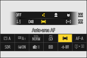 AF-områdemodus kan velges ved å bruke [ AF-søkefeltfunksjon/motivreg. ]-elementet i i menyen eller [ AF-søkefeltfunksjon ]-elementene i menyene for fotografering og videoopptak.