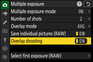 For å lagre både flereksponeringen og bildene som utgjør den, velg [ ON ]; de individuelle bildene lagres i NEF ( RAW )-format. For å lagre bare flereksponeringen, velg [ OFF ].