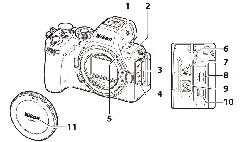 - Stopka akcesoriów (do opcjonalnej lampy błyskowej; 0 Korzystanie z lampy błyskowej zamontowanej na aparacie , Zgodne lampy błyskowe )