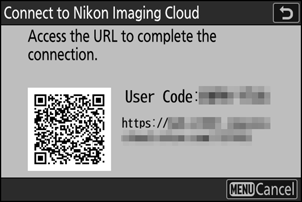Wyświetli się kod QR i adres URL umożliwiający dostęp do usługi Nikon Imaging Cloud na komputerze lub urządzeniu inteligentnym.