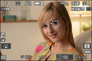 - Wybierz [ Wszystkie ], aby włączyć wykrywanie obiektów we wszystkich obszarach kadru. Jeśli zostanie wykryty więcej niż jeden obiekt wybranego typu, szary punkt ostrości pojawi się nad każdym z wykrytych obiektów, a początkowy obiekt wybrany przez aparat zostanie oznaczony ikonami e i f . Punkt ostrości można ustawić nad innymi obiektami, naciskając 4 lub 2 .