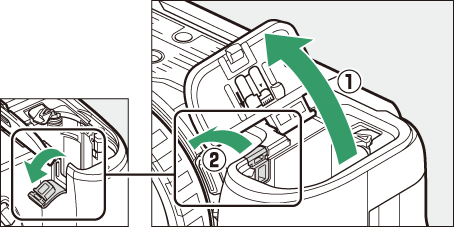 Deschideți compartimentul bateriei ( q ) și capacele conectorului de alimentare ( w ).