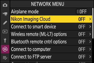 Cameră: Evidențiați [ Nikon Imaging Cloud ] în meniul de rețea și apăsați 2 .