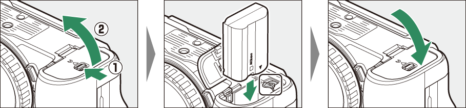 Pentru a scoate bateria, opriți camera și deschideți capacul camerei bateriei. Apăsați zăvorul bateriei în direcția indicată de săgeată pentru a elibera bateria și apoi scoateți bateria cu mâna.