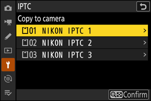 Pentru a copia presetări IPTC de pe cameră pe un card de memorie, selectați [ Încărcare/salvare ] > [ Fanta 1 ] sau [ Fanta 2 ], apoi evidențiați [ Copiere pe card ] și apăsați 2 . Selectați presetarea și destinația dorite (1–99) și apăsați J pentru a copia presetarea pe card.
