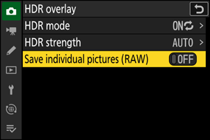 Выберите [ ON ], чтобы сохранить каждый из отдельных снимков, использованных для создания HDR-изображения; снимки сохраняются в формате NEF ( RAW ).