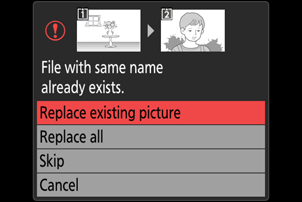 - Ak cieľový priečinok obsahuje súbor s rovnakým názvom ako jeden z obrázkov na kopírovanie, zobrazí sa dialógové okno s potvrdením. Ak chcete nahradiť existujúci súbor alebo súbory, vyberte možnosť [ Replace existing picture ] alebo [ Replace all ]. Chránené súbory v cieľovom priečinku nebudú nahradené. Ak chcete pokračovať bez nahradenia existujúcich súborov, vyberte položku [ Skip ]. Výberom možnosti [ Cancel ] ukončíte proces bez kopírovania ďalších obrázkov.