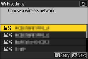 - Če se želite povezati z omrežjem s skritim SSID , označite prazen vnos in pritisnite J Nato pritisnite J ; kamera vas bo pozvala, da vnesete SSID .