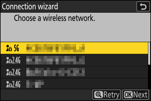 - Če se želite povezati z omrežjem s skritim SSID , označite prazen vnos in pritisnite J Nato pritisnite J ; kamera vas bo pozvala, da vnesete SSID .