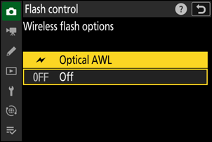 Oddaljene bliskavice je mogoče upravljati prek optičnih signalov iz izbirne bliskavice, ki je nameščena na nastavku za dodatno opremo fotoaparata in deluje kot glavna bliskavica (optični AWL ). Za informacije o združljivih bliskavicah glejte »Funkcije, ki so na voljo z bliskavicami, združljivimi s CLS « ( 0 Funkcije, ki so na voljo z bliskavicami, združljivimi s CLS ).