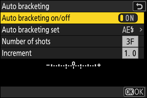 - Када је [ 1/3 EV koraci (korekcija 1/3 EV) ] изабрано за прилагођену поставку б2 [ EV koraci za kontrolu ekspozicije ], величина инкремента се може изабрати између 0,3 (¹⁄₃), 0,7 (²⁄₃), 1,0, 1,3 (1+1⁄²), 1,0, 1,3 (1+1⁄²),+1⁄². 2,0, 2,3 (2+¹⁄₃), 2,7 (2+²⁄₃) и 3,0 ЕВ. Програми брацкетинга са прирастом од 2,0 ЕВ или већим нуде максимално 5 снимака. Ако је у кораку 3 изабрана вредност од 7 или 9, број снимака ће аутоматски бити подешен на 5.