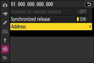 - Ако желите, можете да уредите ИП адресу камере тако што ћете означити [ Adresa ] и притиснути 2 . Да бисте се поново повезали, изаберите [ ON ] за [ Poveži se sa daljinskim fot. ]. Неће бити успостављена веза ако на наведеној адреси не постоји удаљена камера.