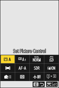Ставке приказане у i менију током снимања могу да се изаберу помоћу прилагођене поставке ф1 или г1 [ Прилагоди i мени ].
