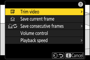 Притиском на дугме i у видео режиму се приказују доле наведене ставке. Означите жељену ставку помоћу џојстика и притисните J да видите опције.