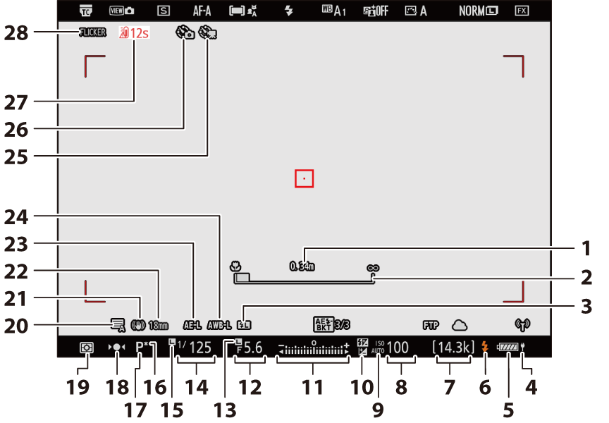 - Om kameratemperaturen blir förhöjd, visas en högtemperaturvarning ( K ) och en nedräkningstimer. När timern når noll stängs fotograferingsdisplayen av.
