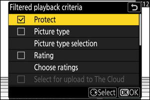 Markera alternativ och tryck på J för att välja ( M ) eller avmarkera ( U ). Under filtrerad uppspelning kommer endast bilder som uppfyller alla kriterier markerade med en bock ( M ) att visas.