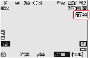 - Medan bracketing är aktiverat visar fotograferingsdisplayen en ADL-variationsikon och antalet återstående bilder i bracketingsekvensen. Efter varje skott kommer antalet kvarvarande skott att minskas med ett.