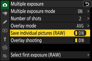 Hem çoklu pozlamayı hem de onu oluşturan çekimleri kaydetmek için [ ON ] öğesini seçin; tek tek çekimler NEF ( RAW ) biçiminde kaydedilir. Yalnızca çoklu pozlamayı kaydetmek için [ OFF ] öğesini seçin.