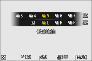 若要进行连拍,请按住c(E)按钮并旋转主指令拨盘选择[低速连拍]、[高速连拍]或[高速连拍(延长)]。